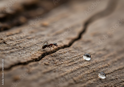 Obraz premium Macro Photography of Ant on Wood with Water Droplets