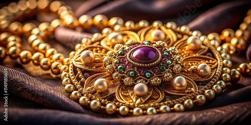 © Adisorn, Obraz premium Macro Photography of Ornate Gold Floral Necklace with Gemstones and Pearls on Dark Fabric