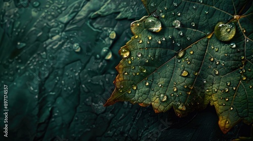 Fototapeta premium Macro photography of raindrops on grapevine leaf on dark green backdrop
