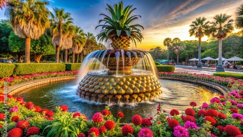 © Man888, Obraz premium Macro Photography of the Ananas Fountain in a Park at the Charleston Harbor, South Carolina, Showcasing Intricate Details and Vibrant Surroundings in a Lush Green Setting