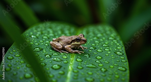 © Afif, Obraz premium Macro Photography Tiny Frog on Dew-Covered Leaf