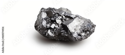 Fototapeta premium Macro shoot of piece of nickel metal ore isolated on a white background. Closeup photo of amazing shiny mineral rough. Copy space image. Place for adding text or design