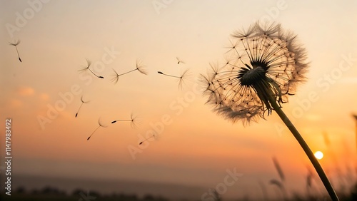 © woopics, Fototapeta premium Macro shot of a dandelion dispersing its seeds in a dreamy background.