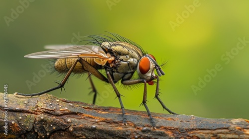 © AlfaSmart, Fototapeta premium Macro shot of a house fly on a branch