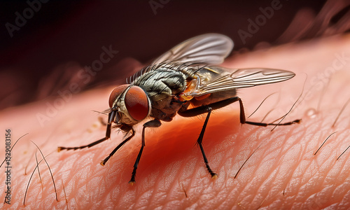© venars.original, Obraz premium macro shot of a housefly crawling on human skin
