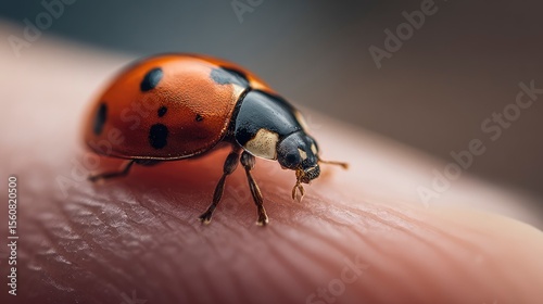 © shooreeq, Naklejka premium Macro shot of a ladybug gently perched on a woman's fingertip, soft daylight, sharp insect detail