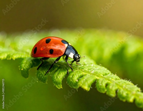 © Recing, Obraz premium Macro shot of a ladybug with spots on a fern leaf
