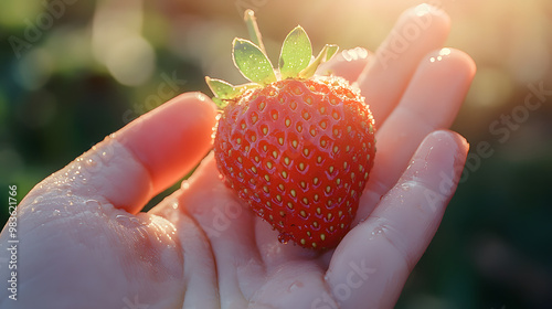 © Theeramisu, Obraz premium Macro shot of a strawberry resting on an outstretched palm, with water droplets glistening