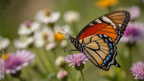 Fototapeta premium Macro shot of A vibrant butterfly perched on a colorful flower. The wings of the butterfly should be open, displaying their full pattern and color. A blooming meadow with a variety of wildflowers. The