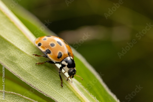 Fototapeta premium Macro shot of a vibrant red ladybug perched on a fresh green leaf. The...