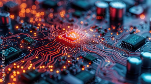 Fototapeta premium Macro shot of an advanced circuit board with red glowing paths, showcasing...