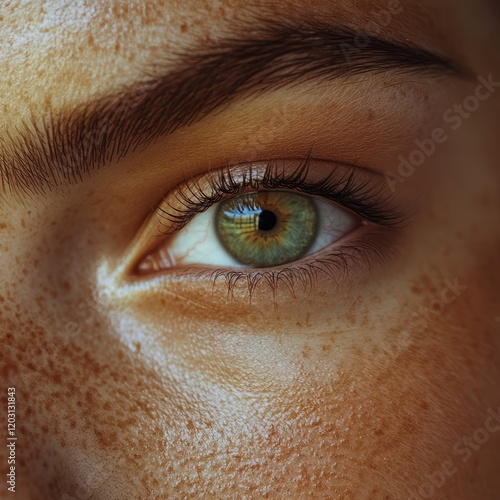 © Aisha, Fototapeta premium Macro shot of an eye framed by thick, natural eyebrows and soft skin tones.