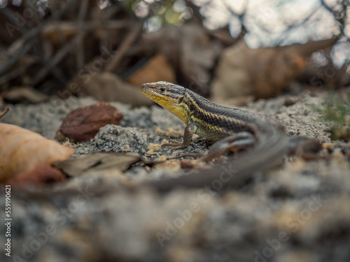 © Digital Blackout, Naklejka premium Macro shot of an Iberian lizard lying between rocks. Autumn day at sunset. Scaled lizard with yellow details in Moratalla, Murcia (Spain). Scale details.