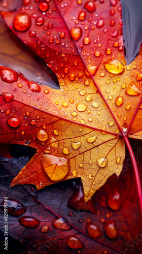 © Jane_S, Obraz premium Macro shot of an orange and red autumn leaf with water droplets, showcasing the vivid colors and natural beauty.