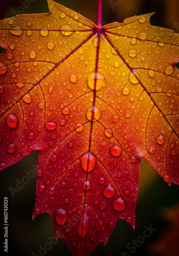 Fototapeta premium Macro Shot of Autumn Leaf with Raindrops