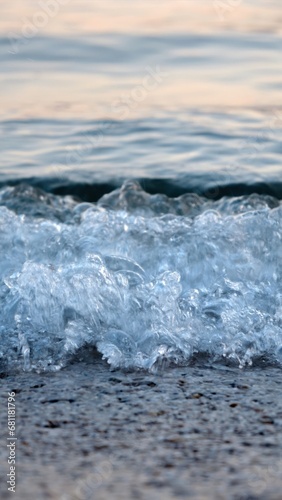 Fototapeta premium Macro shot of calm blue sea waves rolling and breaking on a sea beach on sunset
