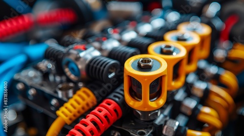 © Alpha, Obraz premium Macro shot of car audio system installation, focusing on the intricate details of the stereo unit, cables, and mounting brackets