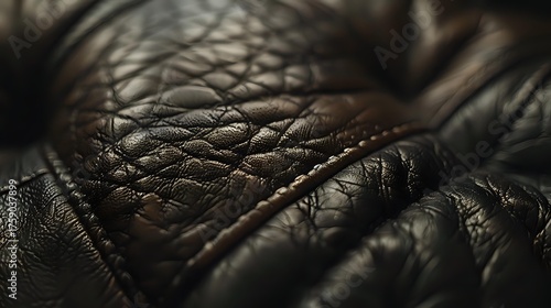© Yuliia, Fototapeta premium Macro shot of dark brown leather texture with quilted diamond pattern stitching, showing detailed grain and craftsmanship in dramatic lighting.