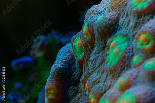 Obraz premium Macro shot of delicate pink coral polyps blooming on a reef, surrounded by...