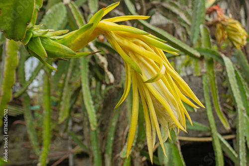 Obraz premium Macro Shot of Dragon Fruit Bud Growing on Cactus Branch