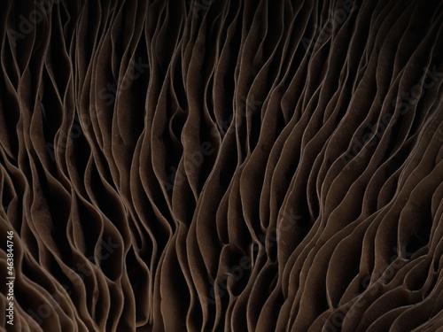 © Dieter Kühl/Wirestock, Fototapeta premium Macro shot of gray gills of an edible mushroom isolated on a black background