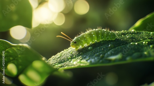© Thavesak, Naklejka premium Macro Shot of Green Caterpillar Creeping on Vibrant Leaf Edge in Nature's Beauty