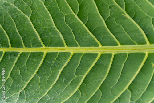 Fototapeta premium Macro shot of green fresh leaf, veins, nature texture, eaten leaf