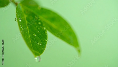 © TheShotSpot, Fototapeta premium Macro shot of green leaves with water droplets against a green background