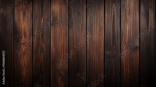 © Chanita, Naklejka premium Macro shot of old dark wood paneling, visible knots and rich brown tones, subtle shadows for depth, cozy and organic ambiance.