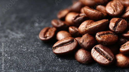 Naklejka premium Macro shot of roasted coffee bean heap on dark surface. Fresh coffee seed background for drink menu design.