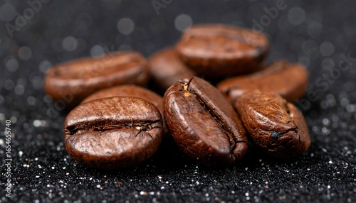 © Satria, Obraz premium Macro shot of roasted coffee beans on a sparkly with dark background.