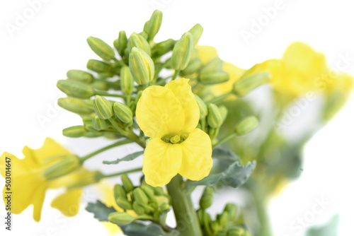 Obraz premium Macro shot of the first white cabbage flowers on a white background.