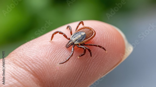 © Kliapko_Photo, Obraz premium Macro shot of tick crawling on person's skin, health risk, virus transmission.