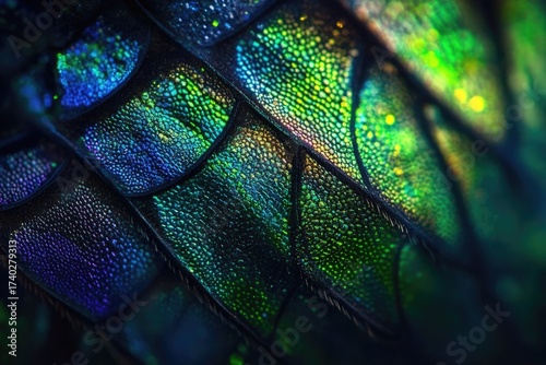 © Thedinindu, Obraz premium Macro shot revealing intricate, iridescent scales with a stunning gradient of shimmering blue and green, showcasing nature's vibrant beauty.