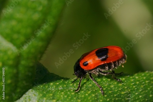 © ramona georgescu, Fototapeta premium Macro shot with a red ant bag beetle on a leaf; Clytra Laeviuscula