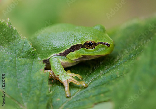 © Wirestock, Naklejka premium Macro shots of a green frog in garden in Bavaria Germany