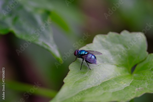 © AnrizStock, Naklejka premium Macro Side View of a Common Bluebottle Fly on a Green Leaf