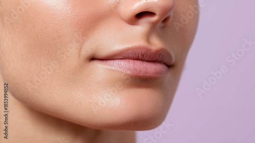 © Marut, Obraz premium Macro skin texture around nose and cheek with natural glow and smooth lips close up, showing healthy facial skin detail and soft natural beauty on light purple background