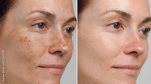 Obraz premium macro split view of cheek with large pores before vs refined smooth pores after,