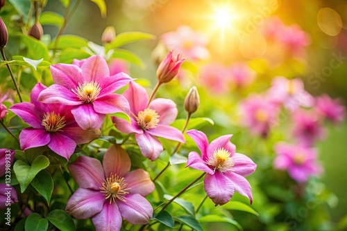 © Autun, Fototapeta premium Macro tilt-shift captures Piilu Clematis's breathtaking pink summer bloom.
