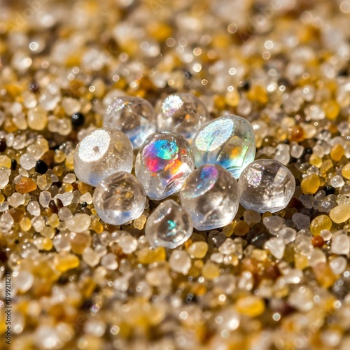 © Vipula, Obraz premium Macro Translucent Mineral Crystals in Desert Sand