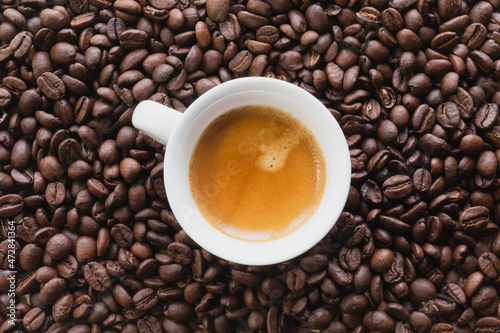 © MarcoDiStefano, Fototapeta premium Macro view flat lays of coffee beans and a cup of coffee background