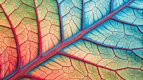 Obraz premium Macro View Leaf Vein Network, Colorful Abstract, Red and Blue Hues, Nature's...