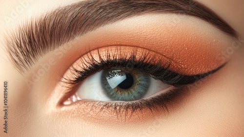 Obraz premium Macro view of a female eye with natural makeup, detailed lashes, and soft brow definition, capturing fashion and beauty in simplicity.