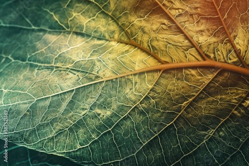 © AkuAku, Obraz premium macro view of a green and yellow leaf. Generative AI
