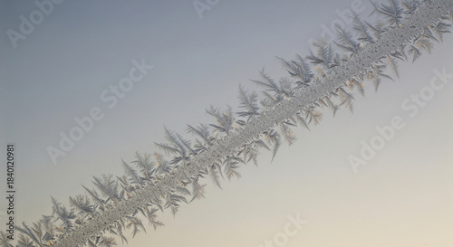 Fototapeta premium Macro view of delicate frost crystals shimmering along a diagonal surface, showcasing the intricate patterns of a cold winter morning against a softly blurred, gradient sky