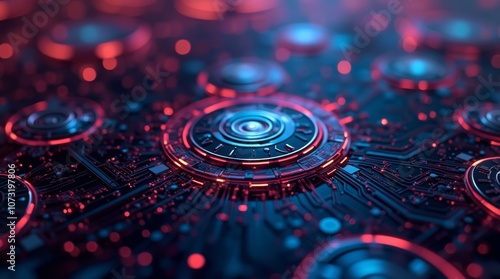 Fototapeta premium Macro view of electronic circuit board, glowing components in red and blue,...