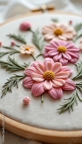 © Riteek, Fototapeta premium Macro view of floral hand embroidery with thick floss on canvas fabric, showing high-relief threadwork and delicate stitching patterns.