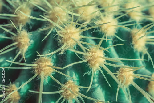 Fototapeta premium Macro view of green cactus with long spines as a background, Echinocactus type