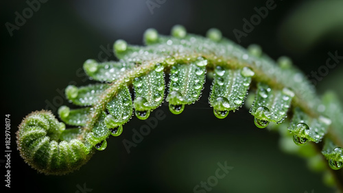 © Rusiru, Naklejka premium Macro View of Green Fern Fiddlehead Unrolling with Dew Drops